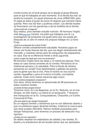 La Gran Fruta es una cadena de jugos naturales y sándwiches caseros fundada en el 2006 por un abogado y un experto en jugos. Comenzaron con una tienda y ahora tienen ocho locales propios y franquicias. Ofrecen comida saludable preparada con frutas frescas y carnes caseras. Su éxito se debe a la calidad de sus productos y el ambiente acogedor. Actualmente planean expandirse a más zonas residenciales de Lima y otorgan franquicias de manera selectiva.