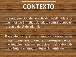 Este documento describe una serie de actividades para que estudiantes de 3-4 años aprendan sobre diferentes frutas. Las actividades incluyen identificar nombres de frutas, dibujar frutas con los colores correctos, buscar imágenes de frutas, probar diferentes frutas traídas por los padres, y llevar un registro de las frutas que comen cada día para aumentar su conocimiento y vocabulario sobre frutas. El objetivo final es que los estudiantes aprendan correctamente los nombres y características de varias frutas.
