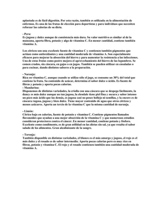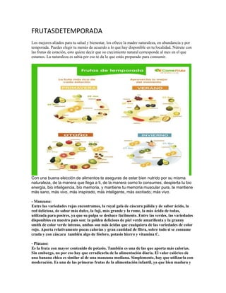Este documento habla sobre las frutas de temporada y sus beneficios para la salud. Explica que la naturaleza provee frutas en abundancia según la estación y que estas frutas contienen los nutrientes apropiados para cada época. Luego describe las propiedades nutricionales y variedades de manzanas, plátanos, peras y cítricos como naranjas, mandarinas, limones y toronjas.