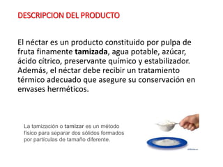 El proceso de producción de néctar de frutas tropicales consiste en obtener la pulpa de frutas como piña, papaya y mango mediante lavado, pelado, trozado y despulpador. Luego, la pulpa se mezcla con agua, azúcar y estabilizantes, se pasteuriza a 85°C para su conservación y se envasa. El producto final debe tener entre 12.5° Brix y pH de 3.5 a 3.8 para asegurar su sabor y estabilidad durante un máximo de 15 días refrigerado.