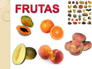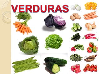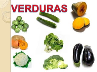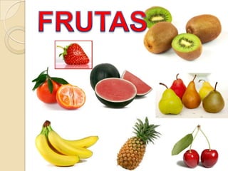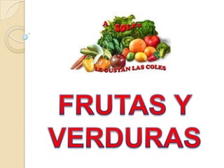 El documento presenta una lista de frutas y verduras ordenadas en una cuadrícula. Contiene nombres de frutas como manzanas, mandarinas, kiwis, peras, uvas, piña, naranjas, plátanos, fresas y albaricoques. También incluye verduras como espinacas, coles, acelgas, puerros, calabaza, zanahorias, sandía, paraguayo, melón, tomates, lechuga, calabacines, judías y pepinos, berenjenas.