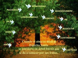 Este documento describe los frutos del Espíritu Santo, que incluyen amor, gozo, paz, paciencia, bondad, benignidad, fe, mansedumbre, modestia y castidad. Cuando el alma se entrega al Espíritu Santo, produce estos frutos que transforman la vida y las relaciones con los demás.
