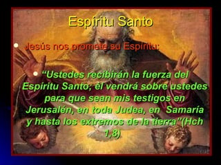 El documento describe los dones y frutos del Espíritu Santo. Explica que Jesús prometió enviar el Espíritu Santo para que sus seguidores fueran testigos de Él en todas partes. El Espíritu Santo otorga siete dones como sabiduría, entendimiento y temor de Dios. También produce nueve frutos del Espíritu enumerados en la Biblia como amor, gozo y paz. La tradición de la Iglesia agrega tres frutos más para un total de doce, entre ellos caridad, paciencia y castidad