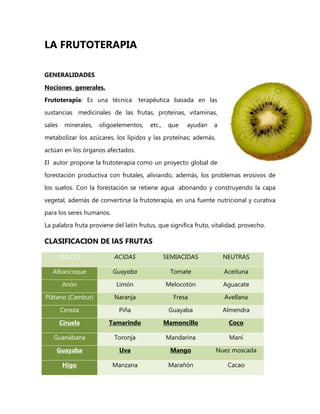 La frutoterapia es una técnica terapéutica basada en las sustancias medicinales de las frutas que ayudan a metabolizar azúcares, lípidos y proteínas, y actúan en órganos afectados. Las frutas contienen vitaminas, minerales y otros elementos que brindan numerosos beneficios para la salud. No obstante, algunas frutas no se deben mezclar para evitar reacciones químicas perjudiciales. La frutoterapia ofrece una alternativa nutritiva y curativa