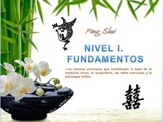 El documento describe los principios fundamentales del Feng Shui chino, incluyendo la energía Chi que fluye a través de todas las cosas, el yin y el yang, y los cinco elementos. Explica que el Chi puede ser positivo o negativo y que el objetivo del Feng Shui es identificar y retener el Chi positivo o evadir el Chi negativo.