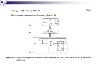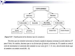 Este documento presenta el tema 6 sobre diseño secuencial con contadores y registros. Introduce conceptos como biestables D, T y J-K y el procedimiento general de síntesis secuencial. Explica la representación de autómatas con matrices de transición y funcionales y cómo sintetizarlos con PLDs. Además, cubre el diseño de contadores asíncronos y síncronos y el uso de registros de desplazamiento.