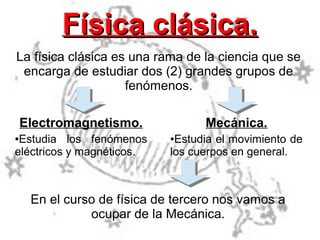 Este documento presenta un resumen del curso de física de tercero. La física clásica estudia la mecánica y el electromagnetismo. El curso se enfocará en la mecánica, la cual incluye la cinemática para describir el movimiento, la dinámica para explicar el origen del movimiento usando fuerza y masa, y el trabajo y la energía para describir movimientos usando magnitudes escalares como la energía y el trabajo.