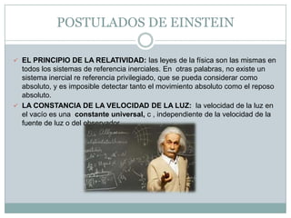 Este documento resume las principales ideas de la física de Einstein. Explica los dos postulados de la relatividad especial de Einstein - el principio de relatividad y la constancia de la velocidad de la luz. También describe cómo la relatividad especial estudia cómo el espacio y el tiempo aparecen para observadores en movimiento relativo constante y cómo condujo a la equivalencia entre masa y energía. Además, resume la teoría general de la relatividad de Einstein, la cual explica que la gravedad es el resultado de la curvatura del espacio-tiempo causada por la presen