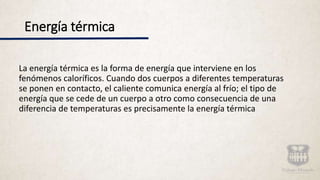 Este documento describe la diferencia entre calor y temperatura. Explica que el calor es la energía térmica que se transfiere entre dos cuerpos debido a una diferencia de temperatura, fluyendo del cuerpo más caliente al más frío. También define las unidades de calor como calorías y BTU, y describe las escalas Celsius, Fahrenheit, Kelvin y Rankine para medir la temperatura.