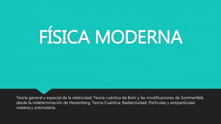 1) La física moderna incluye la teoría general y especial de la relatividad de Einstein, la teoría cuántica de Bohr y Sommerfeld, y la mecánica cuántica de Heisenberg.
