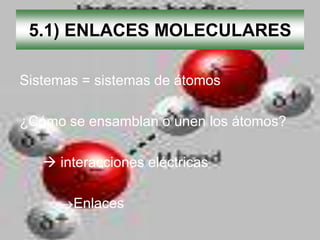 El documento describe los diferentes tipos de enlaces moleculares, incluyendo enlaces iónicos, covalentes, de Van der Waals y metálicos. También discute las energías rotacionales y vibracionales de las moléculas, y cómo estas propiedades se manifiestan en los espectros moleculares. Finalmente, cubre los enlaces en sólidos iónicos como NaCl, incluyendo su estructura cristalina y energía cohesiva.