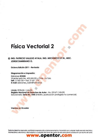 Fisica Vectorial el libro más ultilizado en carreras de Física matemático en la secundaria e universidades, pues aqí les dejo su autor el Ing. Patricio Vallejo docente de la E.P.N.es un libro muy práctico y la manera de aprender con este es súper sencillo... aprovechen y aprendan Física ;) ahhh no olviden Aplicar las normas APA. (Vallejo,P.(2011).Física vestorial 2,Tomo 2, octava edición, Editorial Rodin, Ecuador...por favor siempre aplicarlas ok y gracias al inge Patricio un gran aporte para la educación