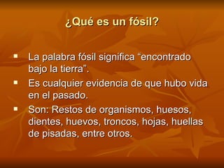 Los fósiles son evidencia de vida pasada como huesos, conchas y huellas que se preservan en la tierra a través de un proceso llamado fosilización. La fosilización transforma químicamente los restos de organismos a través del tiempo y puede ocurrir de varias formas como petrificación, molde o momificación. Los paleontólogos buscan y extraen fósiles cuidadosamente usando herramientas como martillos y cinceles para estudiar la vida del pasado.