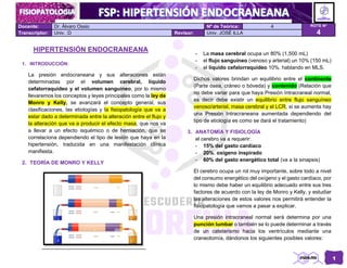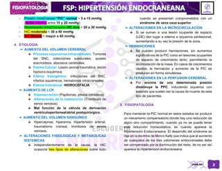 El documento aborda la hipertensión endocraneana, explicando su fisiopatología, incluyendo la teoría de Monro-Kelly y los factores que afectan la presión intracraneana. Se describen las etiologías, así como las fases de compensación y herniación, y se destacan síntomas clínicos como cefalea, vómitos y papiledema. Finalmente, se enfatiza la importancia de un diagnóstico adecuado y el tratamiento de la causa subyacente para un manejo efectivo.