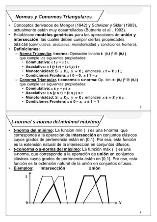 Este documento describe operaciones básicas con conjuntos difusos como la unión, intersección y negación. También introduce conceptos como normas y conormas triangulares, que establecen modelos genéricos para las operaciones de unión e intersección. Finalmente, explica diferentes operaciones de agregación para combinar conjuntos difusos, como sumas simétricas y operadores OWA.