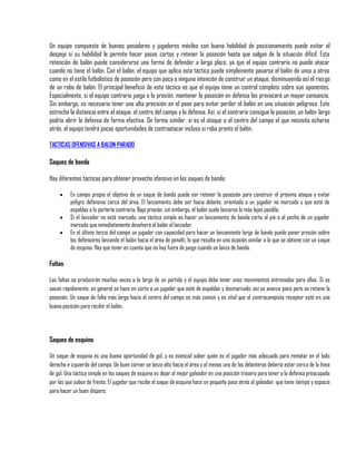 El documento habla sobre el fútbol. Explica que es un deporte entre dos equipos de 11 jugadores que tratan de anotar goles en el arco contrario respetando las reglas. También describe algunas tácticas defensivas como despejar el balón para ganar tiempo, y tácticas ofensivas como saques de esquina y aprovechar espacios detrás de la defensa.
