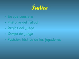 El documento resume las características básicas del fútbol, incluyendo que es un deporte jugado entre dos equipos de 11 jugadores cada uno, con el objetivo de introducir la pelota en la portería rival. Brevemente describe la historia del fútbol y cómo se desarrolló en las Islas Británicas. Explica que el fútbol sigue 17 reglas principales y describe las dimensiones básicas del campo de juego, además de definir las posiciones tácticas básicas de los jugadores como portero, defensa