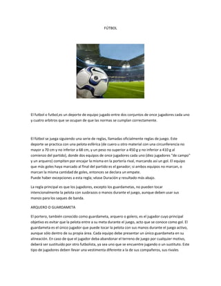 El documento describe los aspectos básicos del fútbol, incluyendo las posiciones de los jugadores (portero, defensa, centrocampista, delantero), las reglas principales como el número de jugadores por equipo y el objetivo de anotar goles, y aspectos como la recepción, el pase y el tiro. El fútbol implica gran actividad física y también riesgo de lesiones.