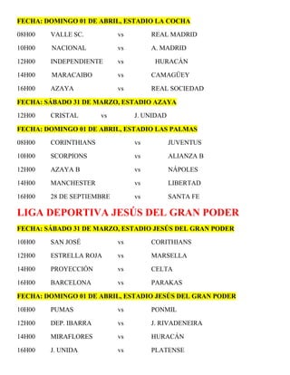 El documento resume las fechas y partidos de varias ligas deportivas barriales que se llevarán a cabo los días 31 de marzo y 1 de abril en diferentes estadios. Incluye los horarios y equipos que jugarán en cada partido de las ligas Deportiva Barrial El Priorato, Deportiva Barrial Alpachaca, Deportiva Jesús del Gran Poder y otras.