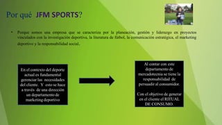 Este documento presenta un proyecto llamado "Fútbol Café Millonarios" que ofrecerá conversatorios sobre la historia y datos del fútbol, la venta de libros sobre fútbol, y pronósticos de partidos. El proyecto se llevará a cabo en un edificio residencial y busca atraer a 180 personas interesadas en el fútbol mediante estrategias de marketing que aprovechen los valores compartidos con el club Millonarios. El presupuesto estimado incluye ingresos por conversatorios, ventas de libros y