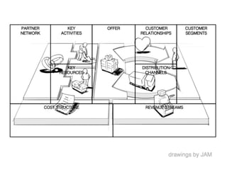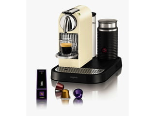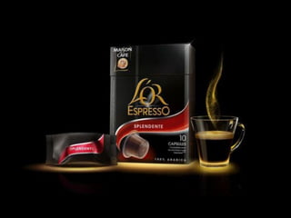 El documento describe el modelo de negocios de Nespresso. Nespresso ofrece cápsulas de café y máquinas de café a clientes minoristas. Mantiene una relación personal con los clientes a través de tiendas minoristas y su sitio web. Genera ingresos a través de las ventas recurrentes de cápsulas y accesorios de café. Sus principales recursos son su marca reconocida y su red de distribución minorista.