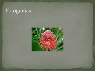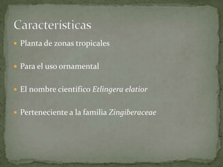 Este documento resume las características de la planta Etlingera elatior. Originaria de Indonesia, es una planta tropical de la familia Zingiberaceae que se usa con fines ornamentales. Su principal parásito es la nematodo Meloidogyne, y sirve de alimento para colibríes.
