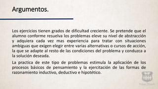Este documento presenta información sobre tablas de valores conceptuales y su uso para resolver problemas. Explica que las tablas pueden incluir variables con valores numéricos o conceptuales como nombres, hechos o características. Los ejercicios propuestos aumentan en dificultad para desarrollar habilidades de abstracción y razonamiento inductivo, deductivo e hipotético. Se incluyen ejemplos de problemas y su resolución usando tablas, con el objetivo de que los estudiantes aprendan a identificar y corregir errores.