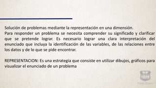 Este documento describe estrategias para representar problemas en una dimensión mediante diagramas. Explica cómo identificar variables, datos y lo que se pide en un problema, y decidir el tipo de representación. También cubre cómo representar datos de manera gradual a medida que se lee el problema, y posponer datos que requieren más información. Proporciona ejemplos de problemas directos, con inversión de datos e indeterminados.