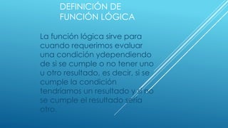 La función lógica SI evalúa una condición y devuelve un resultado u otro dependiendo de si la condición es verdadera o falsa. La función SI toma tres parámetros: una prueba lógica, un valor si la prueba es verdadera, y un valor si la prueba es falsa. Esta función es útil para tomar decisiones basadas en el resultado de una evaluación lógica.