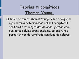 El documento describe diferentes teorías sobre el funcionamiento del ojo humano. La teoría tricromática de Thomas Young estableció que el ojo contiene células receptoras sensibles a longitudes de onda específicas que permiten ver distintos colores. La teoría de los procesos opuestos de Hering explica fenómenos como la post-imagen y la mezcla aditiva de colores. La teoría doble proceso sugiere que el procesamiento del color implica primero la detección de longitudes de onda y luego procesos opuest