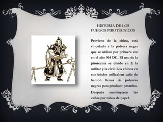 Este documento resume la historia y los tipos de fuegos pirotécnicos. Comenzó en China hace aproximadamente 1100 años y se expandió a Europa a través de los árabes, Marco Polo y las Cruzadas. Incluye diferentes tipos como cohetes, petardos y bengalas. Explica la composición básica y los peligros de la pirotecnia, incluidas las quemaduras y los daños a la audición.