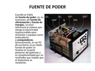 Este documento describe las características y diferencias entre las fuentes de poder AT y ATX utilizadas en computadoras. Explica que las fuentes de poder suministran la electricidad necesaria para alimentar equipos como computadoras y se localizan típicamente en la parte posterior del gabinete. Luego detalla las diferencias clave entre las fuentes AT y ATX, como los conectores utilizados y la forma en que se encienden. Finalmente, enfatiza la importancia de elegir una fuente de buena calidad para mejorar el rendimiento y la vida ú