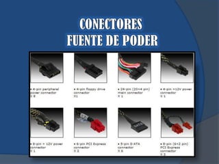 La fuente de alimentación es un dispositivo que convierte la corriente alterna de la red eléctrica en corriente directa para alimentar los componentes electrónicos de un ordenador. Existen dos tipos principales: las fuentes AT de encendido mecánico y las fuentes ATX de encendido digital. Mientras que las fuentes AT se desconectan completamente al apagarse, las fuentes ATX permanecen en modo de espera consumiendo electricidad incluso cuando el ordenador está apagado.