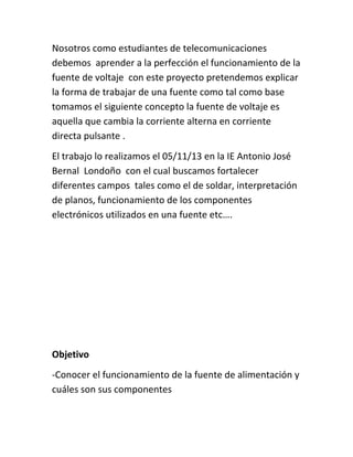 Este documento describe el funcionamiento de una fuente de voltaje. Explica que una fuente de voltaje convierte la corriente alterna de la red eléctrica en corriente directa pulsante para alimentar dispositivos electrónicos. Detalla los componentes clave de una fuente que incluyen un transformador, rectificador, filtro y regulador. El objetivo es que los estudiantes comprendan cómo funciona una fuente de voltaje y aprendan a construir una usando componentes como diodos y generadores reguladores.