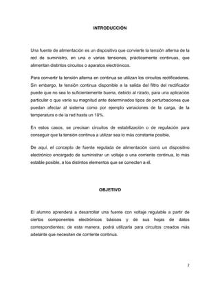 La fuente de voltaje regulable convierte la tensión alterna de la red eléctrica en una tensión continua y estable para alimentar circuitos electrónicos. El documento describe los componentes de la fuente, incluyendo el transformador, rectificador, filtros y regulador LM317, así como el funcionamiento de cada parte y las observaciones del proceso de construcción.