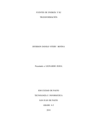 Este documento resume las principales fuentes de energía renovables y no renovables. Entre las energías renovables se encuentran la energía mareomotriz, geotérmica, hidráulica, eólica, solar y de biomasa. Las fuentes no renovables incluyen combustibles fósiles como el carbón, petróleo y gas natural, así como la energía nuclear. El documento explica brevemente cada fuente y proporciona ilustraciones para apoyar la comprensión.