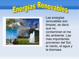 El documento describe las principales fuentes de energía renovables y no renovables. Las energías renovables más importantes provienen del sol, el viento, el agua y la biomasa, y pueden transformarse en energía térmica o eléctrica mediante paneles solares, aerogeneradores, centrales hidroeléctricas y plantas de biomasa. Las fuentes de energía no renovables más utilizadas son el petróleo, el carbón, el gas natural y la energía nuclear, pero se agotarán en el futuro.