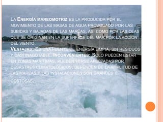 El documento describe varias fuentes de energía renovables y no renovables. Entre las renovables se encuentran la energía mareomotriz, hidráulica, eólica, solar y de biomasa. Cada una tiene ventajas como ser limpias e inagotables, pero también inconvenientes como su intermitencia o alto costo. Las no renovables son los combustibles fósiles como el carbón y el petróleo, y la energía nuclear, cuya velocidad de consumo supera a su regeneración.