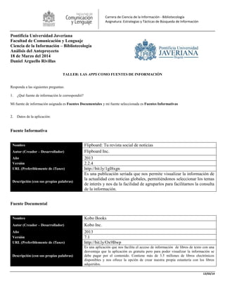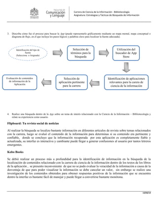 Este documento describe el análisis de dos aplicaciones móviles como fuentes de información para la carrera de Ciencia de la Información - Bibliotecología. La primera aplicación analizada es Flipboard, una revista social de noticias. La segunda aplicación es Kobo Books, una aplicación que facilita el acceso a libros electrónicos. El documento incluye la descripción, búsqueda y referenciación de cada aplicación según el estilo APA.