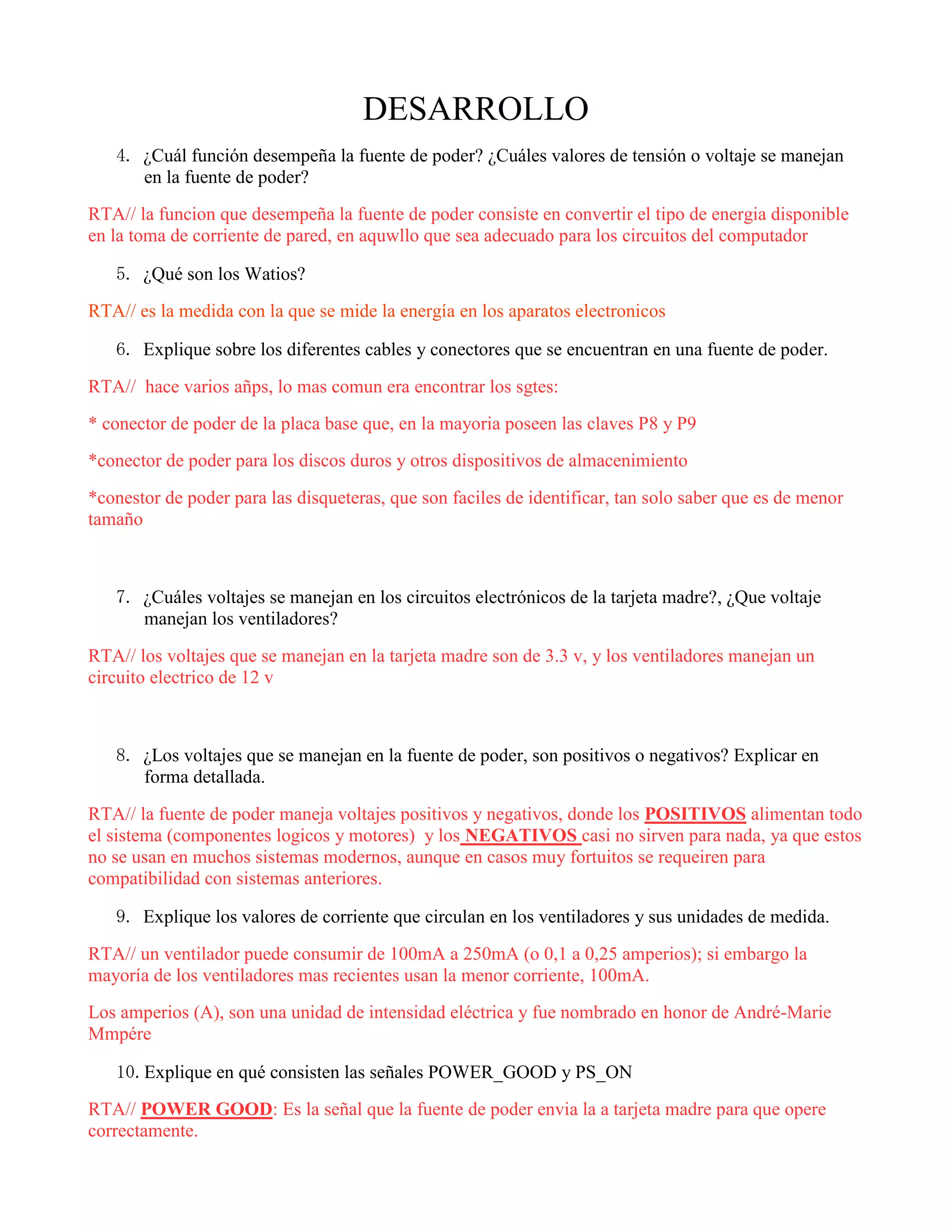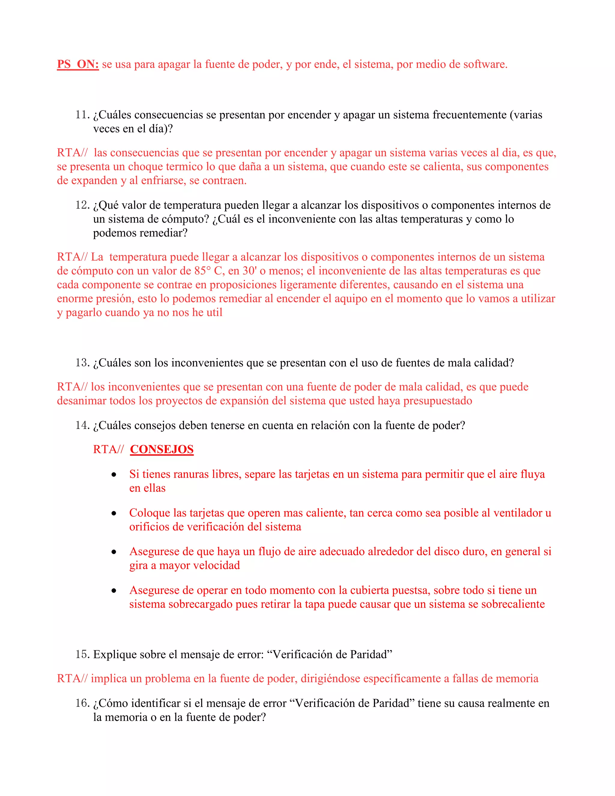 La fuente de poder convierte la energía de la toma de corriente a voltajes adecuados para los circuitos del computador, como 3.3V y 12V. Maneja voltajes positivos que alimentan el sistema y voltajes negativos que ya no se usan comúnmente. Problemas en la fuente de poder incluyen fallas en el encendido, sobrecalentamiento, y errores de "verificación de paridad" en la memoria. Para prevenir daños, se debe ventilar adecuadamente el sistema y no encender/apagar frecuentemente