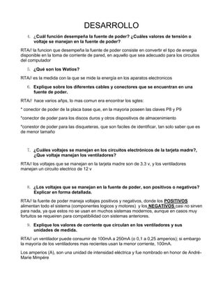 La fuente de poder convierte la energía de la toma de corriente a voltajes adecuados para los circuitos del computador, como 3.3V y 12V. Maneja voltajes positivos que alimentan el sistema y voltajes negativos que ya no se usan comúnmente. Problemas en la fuente de poder incluyen fallas en el encendido, reinicios espontáneos, errores de memoria y sobrecalentamiento, poniendo en riesgo los componentes. Para prevenir daños, se deben seguir normas de seguridad como no manip