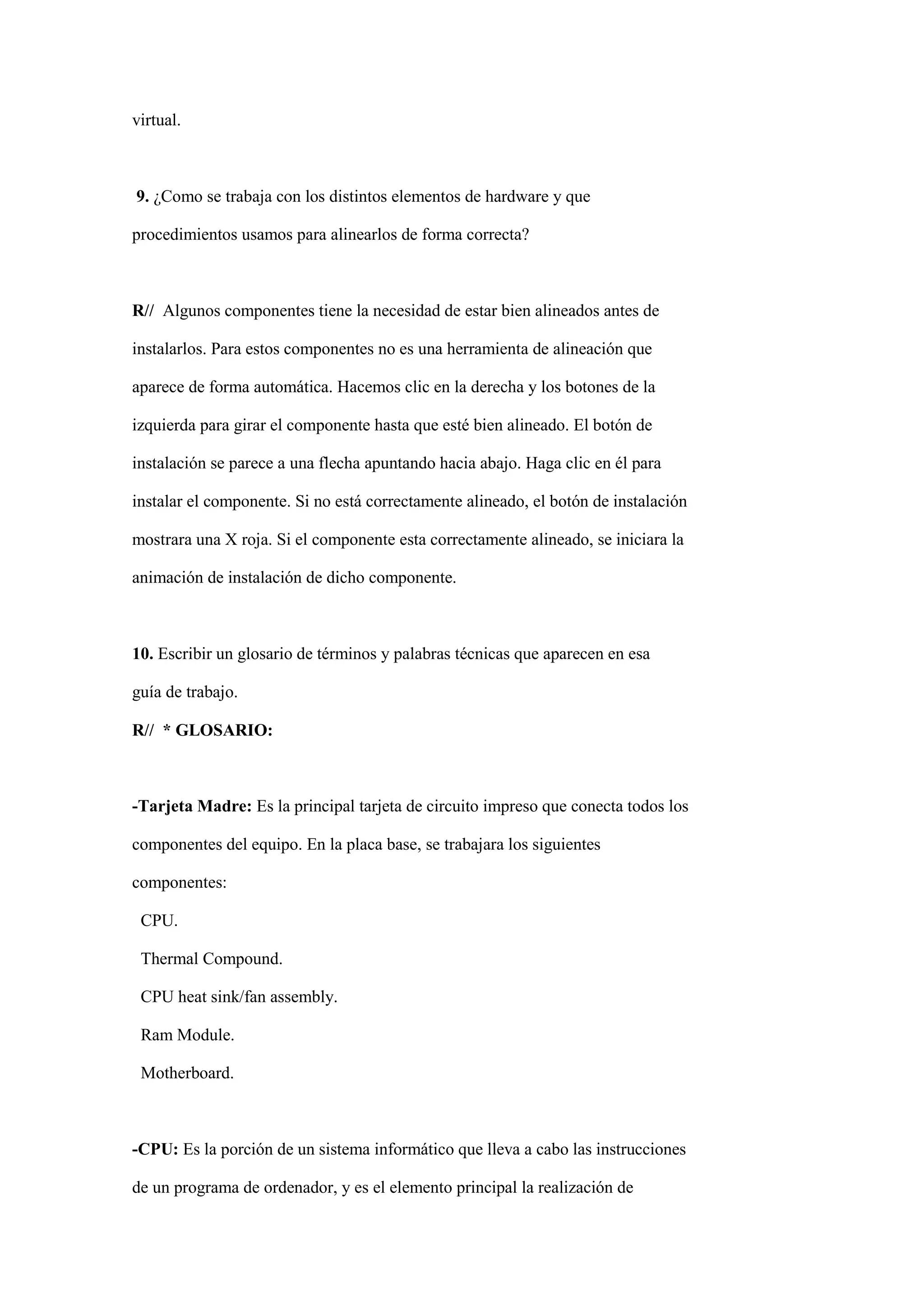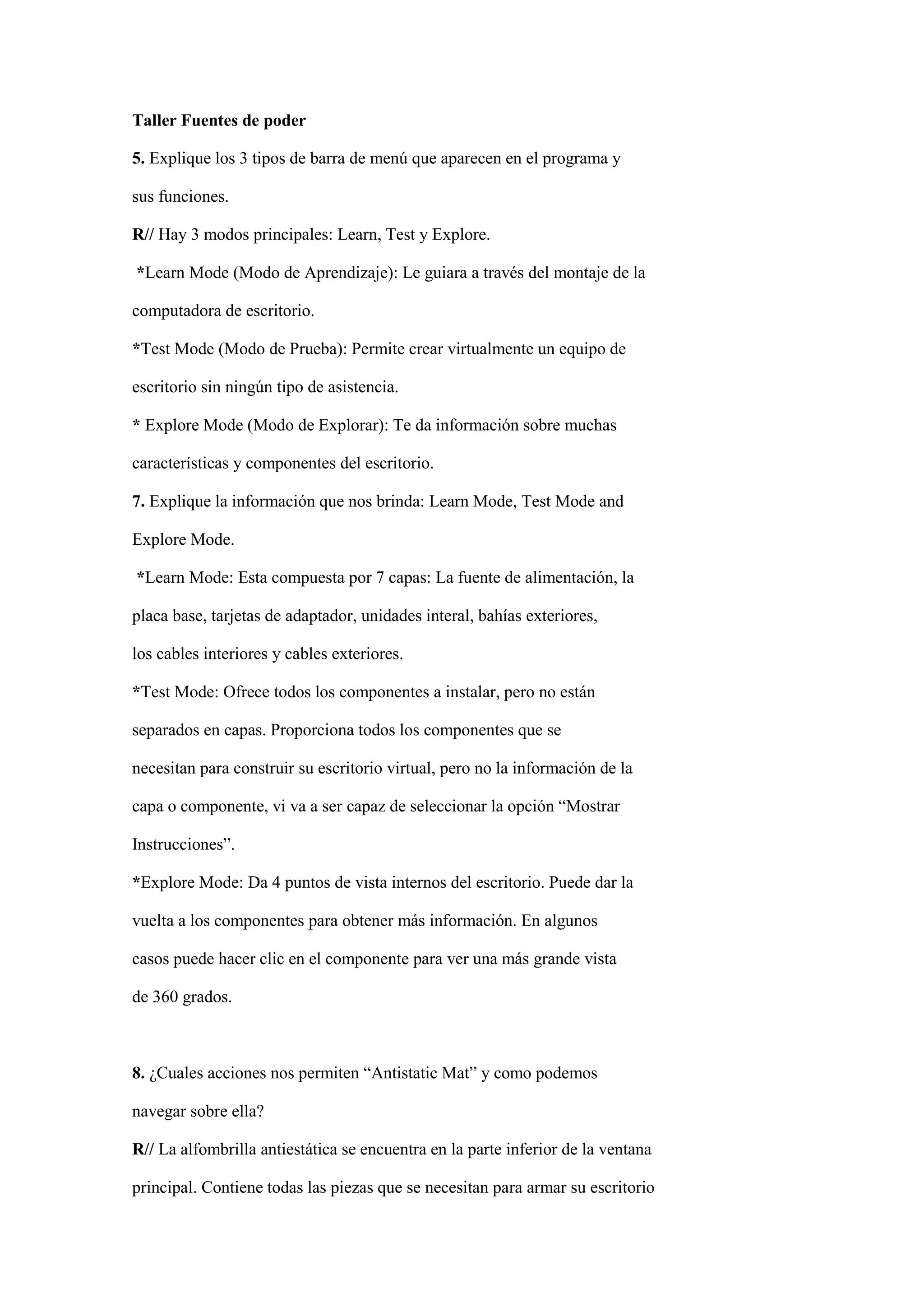 El documento describe las tres modalidades (Learn Mode, Test Mode, Explore Mode) de un programa de ensamblaje de computadoras. Learn Mode guía al usuario a través del ensamblaje en capas. Test Mode proporciona todos los componentes sin instrucciones. Explore Mode permite al usuario explorar y obtener información sobre los componentes internos desde diferentes ángulos. El documento también explica cómo alinear correctamente los componentes de hardware y la función de la alfombra antiestática.