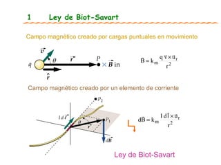 El documento resume las principales fuentes del campo magnético, incluyendo la ley de Biot-Savart, el campo magnético creado por corrientes eléctricas, la fuerza entre corrientes paralelas descrita por la ley de Ampère, el campo magnético producido por un solenoide, y la ley de Gauss para el magnetismo. También incluye una bibliografía de libros de texto sobre física clásica y moderna.