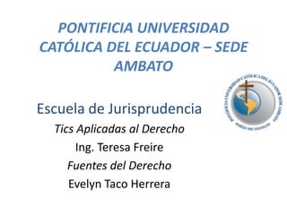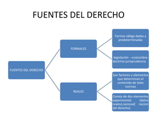 Este documento discute las diferentes perspectivas sobre las fuentes del derecho según varios autores como Genny, Cuento Rua y Cossio, Abelardo Torres y Savigny. Se describen las fuentes formales como la legislación, costumbre, doctrina y jurisprudencia. También se mencionan las fuentes reales y el pensamiento de que las fuentes no solo proveen orientación para casos litigiosos sino que coordinan la actividad social. Finalmente, Savigny considera que la fuente verdadera es la vida invisible del derecho en la conciencia común del pue