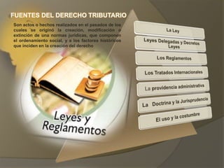 Este documento describe las principales fuentes del derecho tributario en Venezuela, incluyendo las leyes, reglamentos, tratados internacionales, providencias administrativas, usos y costumbres, doctrina y jurisprudencia. También explica las diferentes clases de tributos como impuestos, tasas y contribuciones especiales, y los efectos económicos de los impuestos como la evasión, fraude fiscal, remoción, protraslación y retrotraslación.