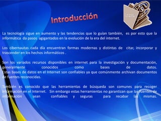El documento presenta información sobre fuentes electrónicas y cómo citarlas correctamente. Explica que las fuentes electrónicas son documentos que contienen referencias a contenido actualizado en sitios web, como blogs y noticias. Describe los formatos RSS y Atom y los beneficios de las fuentes electrónicas. También incluye ejemplos de cómo citar recursos electrónicos de acuerdo a estilos como APA y MLA.
