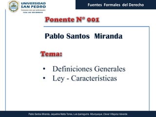 Este documento describe las fuentes formales del derecho. Explica que las fuentes formales son los actos u hechos que dan lugar a la creación, modificación o extinción de las normas jurídicas, como también los órganos que emiten las leyes. Luego detalla las características de la ley, incluyendo sus características externas como generalidad y legitimidad formal, e internas como honestidad y claridad. También cubre los tipos de leyes, el proceso de elaboración legal y conceptos como leyes orgánicas y habilitantes