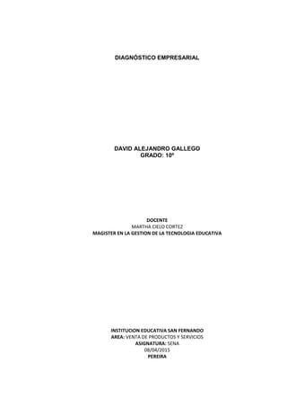 Este documento presenta un diagnóstico empresarial realizado por David Alejandro Gallego para la asignatura SENA. Incluye definiciones de fuentes primarias y secundarias de información, una descripción del diagnóstico empresarial y sus objetivos, y un análisis DOFA de la empresa que identifica fortalezas como la gama de productos y ubicación, debilidades como la relación con socios y poco personal, oportunidades como el desarrollo gracias a la calidad, y amenazas como la competitividad y alzas de preci