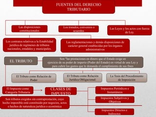 El documento habla sobre las fuentes del derecho tributario en Venezuela, incluyendo las disposiciones constitucionales, tratados internacionales, leyes y reglamentos. Define el tributo como prestaciones en dinero que el Estado exige a través de una ley para cubrir sus gastos. Explica que los impuestos son tributos sin contraprestación directa cuya base está constituida por actos jurídicos o económicos. Además, clasifica los impuestos en periódicos e instantáneos, subjetivos u objetivos, y directos e indirectos. Final