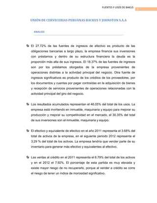 Este documento resume la situación financiera de la empresa peruana Unión de Cervecerías Peruanas Backus y Johnston S.A.A. en 2011 y 2012. Las principales fuentes de ingresos de efectivo de la empresa provienen de obligaciones bancarias a largo plazo (27.72%) y préstamos otorgados (18.37%). La mayor parte de los usos de efectivo se destinan a resultados acumulados (46.05%) e inversiones en inmueble, maquinaria y equipo (30.35%). La empresa tiene niveles bajos de efect